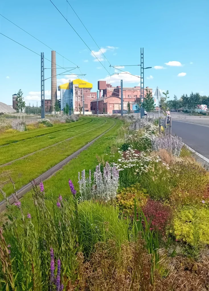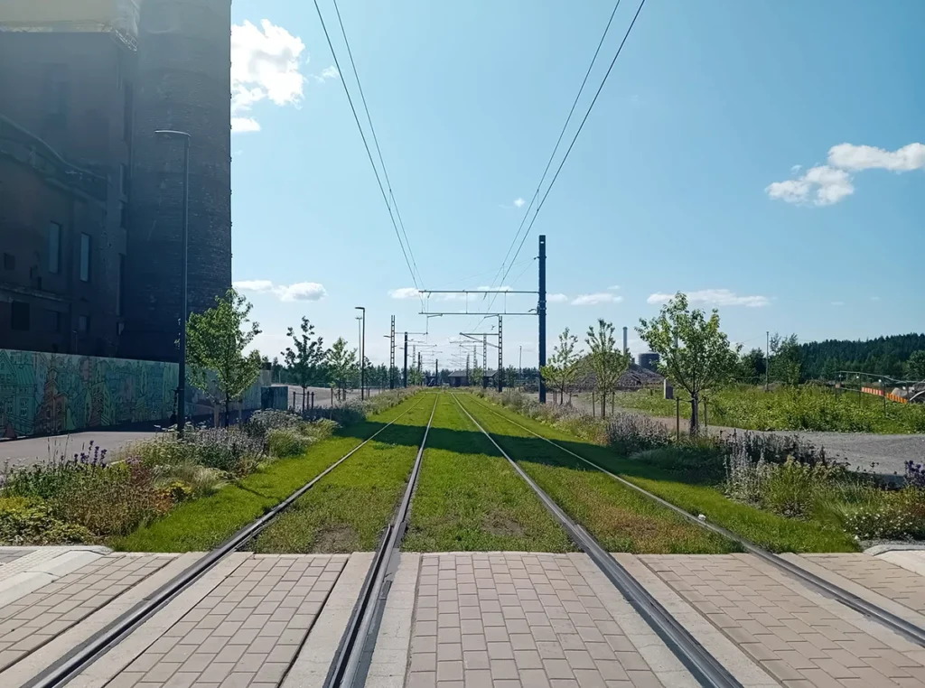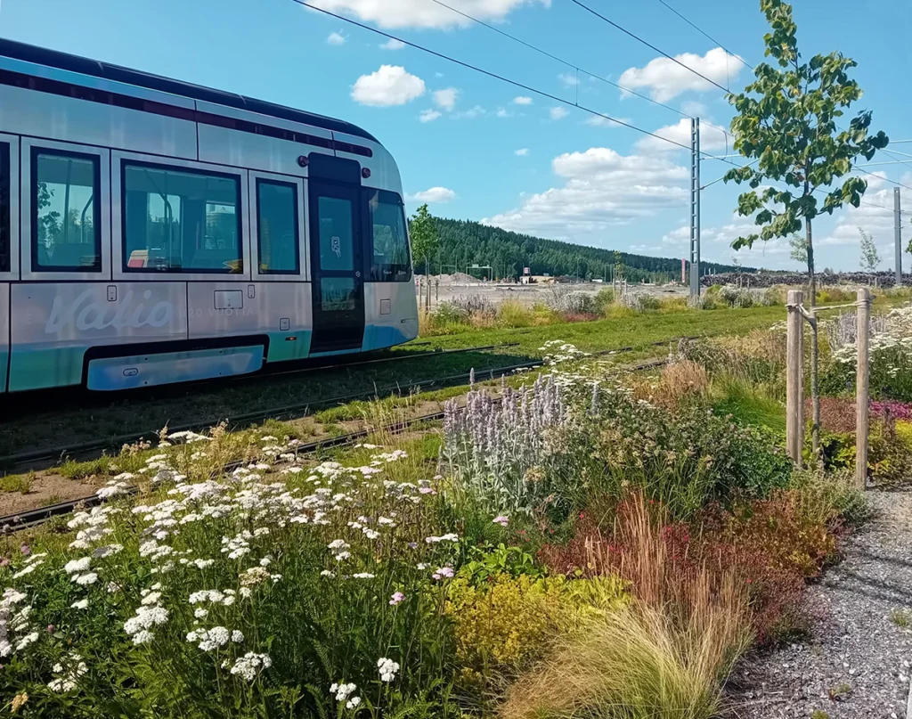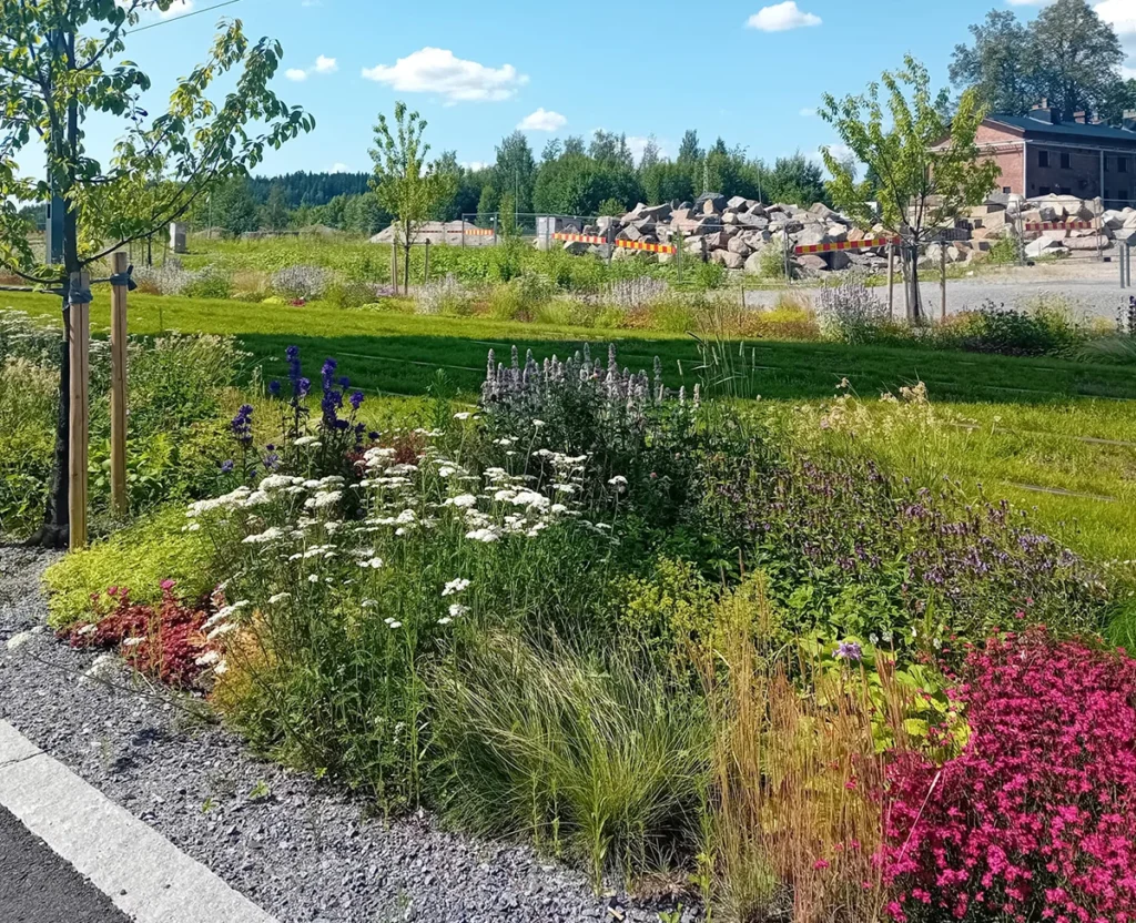 Perennamatto – kuitupohja, johon istutetaan erilaisia ruohovartisten monivuotisten kasvien yhdistelmiä – esikasvatettiin kohdetta varten ja asennettiin valmiina hulevesimultapohjaan. Kuitumattoja oli 3036 ja niitä asennettiin noin 300 metrin matkalle molemmin puolin väylää. Voit lukea aiheesta lisää blogin puolella!